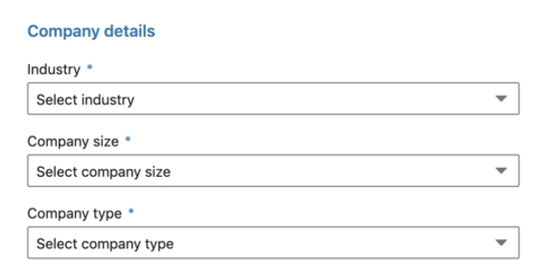 You will need to provide your company details using drop-down menus that indicate your industry, company size, and company type (public, non-profit, educational, etc.)